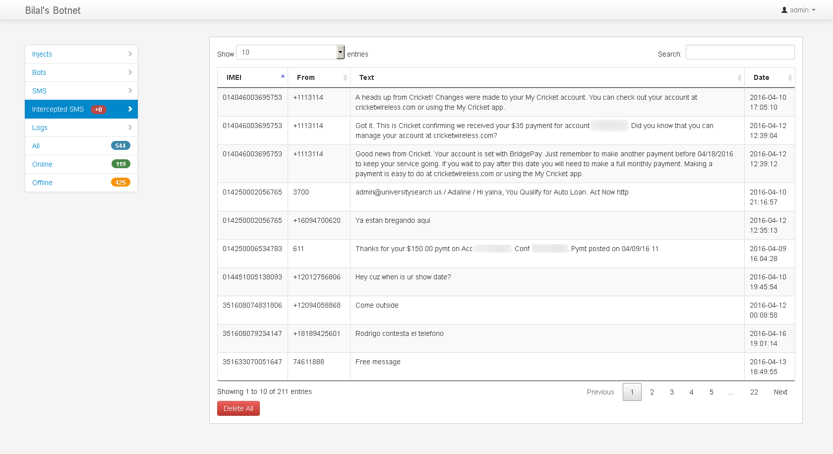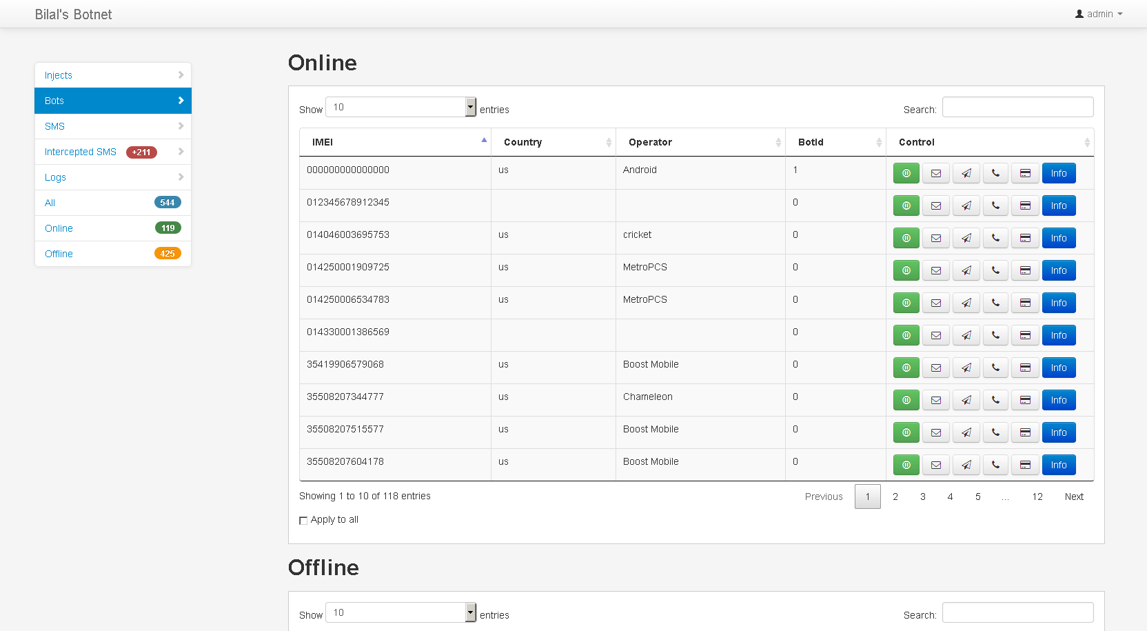 Практически все банкботы используют веб-админку, предоставляющую ботоводам подробную статистику по инфицированным девайсам и похищенной на них информации.